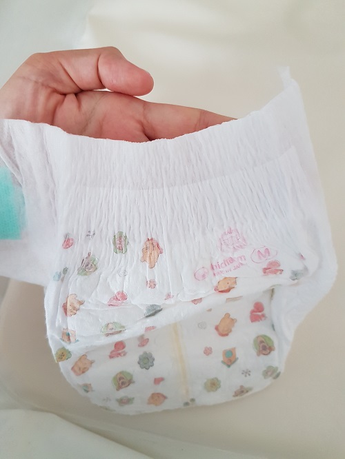 Like most diaper brands, Moony diapers come with a wetness indicator. When dry, the double lines are yellow. When wet, the lines turn blue. The diapers are long enough and come with gathers at the back to prevent backflow pee leakage. The gathers are soft and stretchy so they do not leave any marks on baby’s skin.