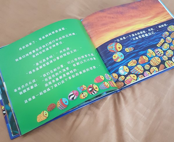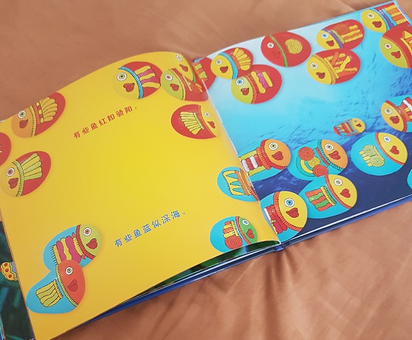 It kind of had this artsy fartsy feel to it with the colourful fishes drawn swimming all around. In terms of level of reading, it is not quite a story that would get a roving toddler who can’t sit still to sit through it. Some pages had few sentences, while others had long paragraphs.